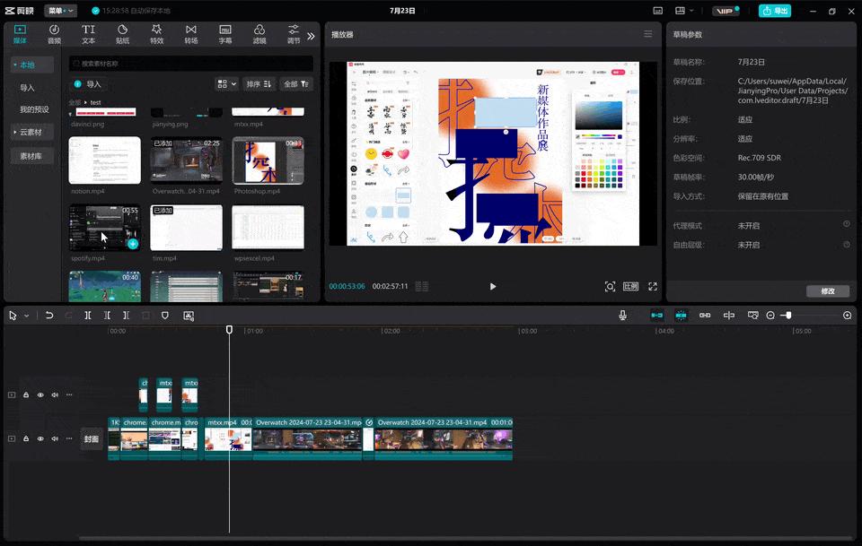 用不了 PR,那么测试一下「国产版」的 剪映好吧。同样是非原生的 x64 版本,整个剪影安装过程没有障碍。除了打开工程文件,拖材料进入轨道时会稍微卡一下,剪辑的感觉可以用流畅来形容。