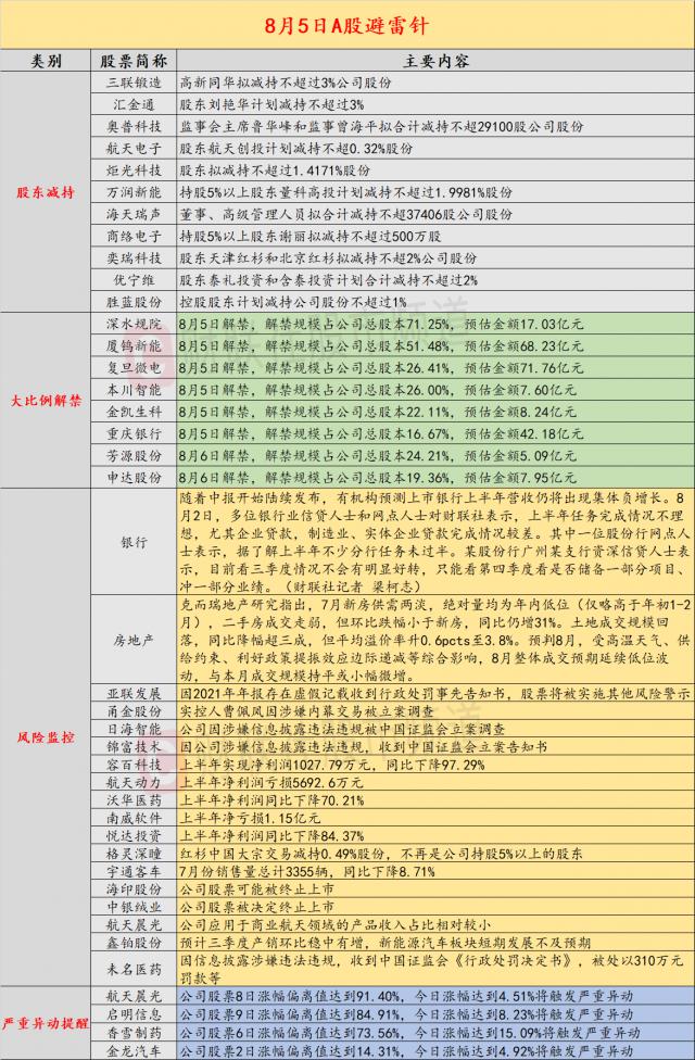 导读:财联社 8 月 5 最近,投资避雷针,A 股票和国外市场的潜在风险事件如下。我们国家的经济信息包括:1)A 上半年股票银行的收入可能会再次集体负增长,部分银行已经开始降低评估标准;2)上半年结婚登记数量再创近年来新低,低于去年同期。 49.8 万对;公司重点关注以下内容:1)亚联发展由于 2021 年度报告中存在虚假记录,收到行政处罚事先通知,股票将被实施其他风险警示;2)隧金股权实际控制人曹佩凤涉嫌内线交易被立案调查;国外市场重点关注:1)纳斯指和标准普通 500 该指数连续三周下跌,英特尔暴跌超过三周。 26%;2)美国 7 每月非农就业人数增加 11.4 万人,大大低于预期。 17.5 万人。