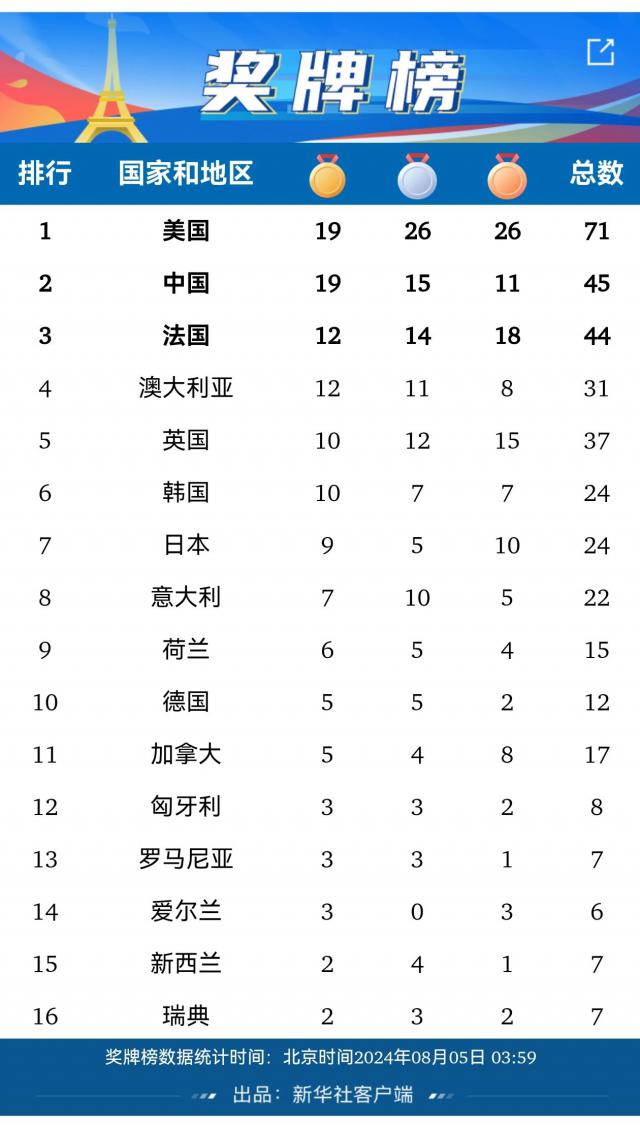 北京时间 8 月 5 日凌晨,在 2024 巴黎奥运会游泳妇女 4X100 在米混合泳接力赛中,由万乐天、唐钱婷、张雨霏、杨浚邈组成的中国队游出。 3 分 53 秒 23 赢得铜牌!在打破世界纪录的情况下,美国队获得了金牌,澳大利亚获得了银牌。