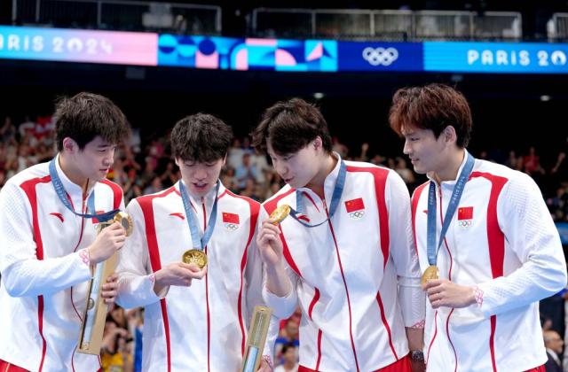 北京时间 8 月 5 日凌晨,在 2024 巴黎奥运会游泳者 4X100 在米混合泳接力赛中,中国队由徐嘉余、海洋、孙佳俊、潘展乐组成。 3 分 27 秒 46 赢得金牌!在这个项目上打破美国队 40 多年来金牌垄断!美国队获得亚军,法国队获得第三名。