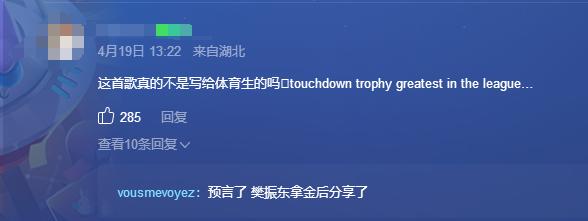 有网友在这个音乐评论区, 4 月感觉这首歌好像是写给体育生的。樊振东夺冠后,有网友回复称“先知”。