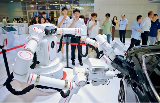 2024 年 6 月 20 日,2024 在国家会展中心(天津)开幕的世界智能产业博览会,给油机器人吸引了观众。