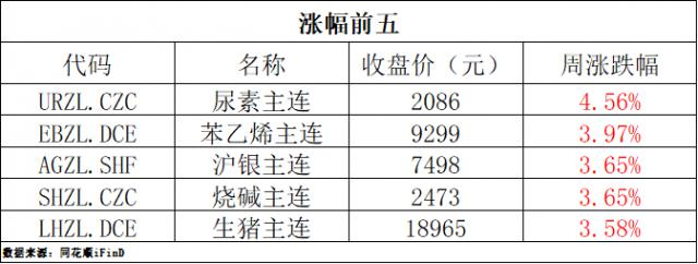 上周国内期货主连续涨幅排名前五的是尿素。 4.56%、丁二烯 3.97%、沪银 3.65%、烧碱 3.65%、生猪 3.58%。