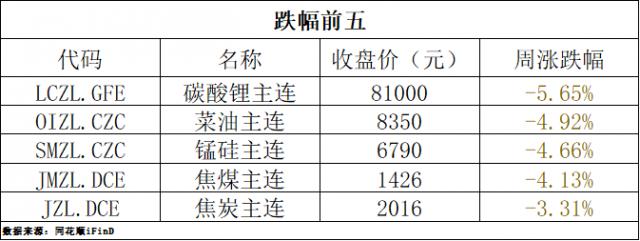 上周,碳酸锂是国内期货主连续跌幅前五的分别。 -5.65%、菜油 -4.92%、锰硅 -4.66%、焦煤 -4.13%、焦碳 -3.31%。