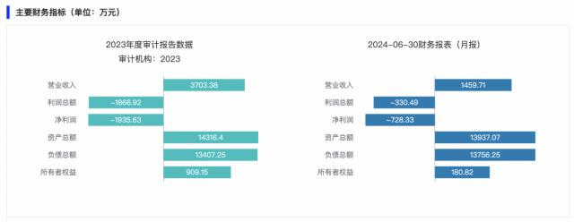 据 2024 年 6 月 30 日本财务报告显示,目标企业的营收 1459.71 净亏损万元 728.33 一万元,总资产 13937.07 负债总额一万元 13756.25 万元。