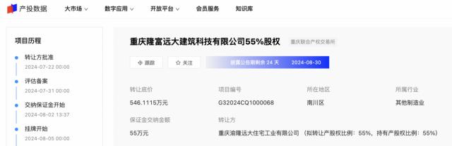 乐居财经 刘治颖 8 月 5 重庆隆富远大建筑科技有限公司 55% 股份挂牌转让,转让底价为 546.1115 重庆渝隆远大住宅工业有限公司,出让方1万元,挂牌结束。 2024-08-30 00:00。