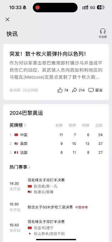 而且因为最近巴黎奥运会的举办,除了顶级新闻之外, 巴黎奥运会最新的比赛信息看板将附在下面。