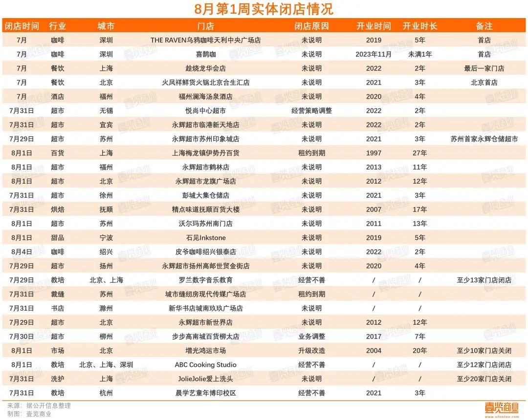 据一览业务不完全统计,8月第一周,至少有66家门店关闭了21个品牌。从行业来看,教育培训行业有26家门店,餐饮行业有7家,超市业态有10家。