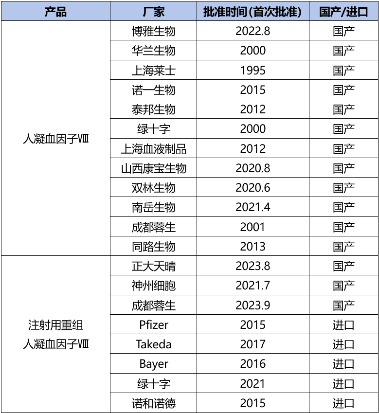 目前国外凝血因子的现状基本上是凝血因子的重组,血液来源的凝血因子逐渐退出市场。血液主要用于提取其他血液产品,如白蛋白(白蛋白不能通过重组生产)。此外,海外已经发展成为凝血因子的长期重组。2014年,Biogen开发的长效重组凝血因子上市,是世界上第一个上市的长效凝血因子。诺和诺德2024年6月28日(注射训妥罗凝血素)α)获得NMPA进口许可,成为国内首个且唯一的长效凝血重组因子。