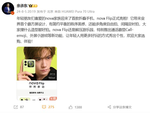 华为常务董事,终端 BG 智能汽车解决方案董事长 BU 董事长余承东微博发布消息,称 nova Flip 在行业内带来了第一款趣方屏设计,具有简洁均衡的秩序美感,还可以多角度自由拍摄,间隔定时拍摄,大家摆任何造型都可以拍摄。