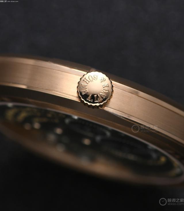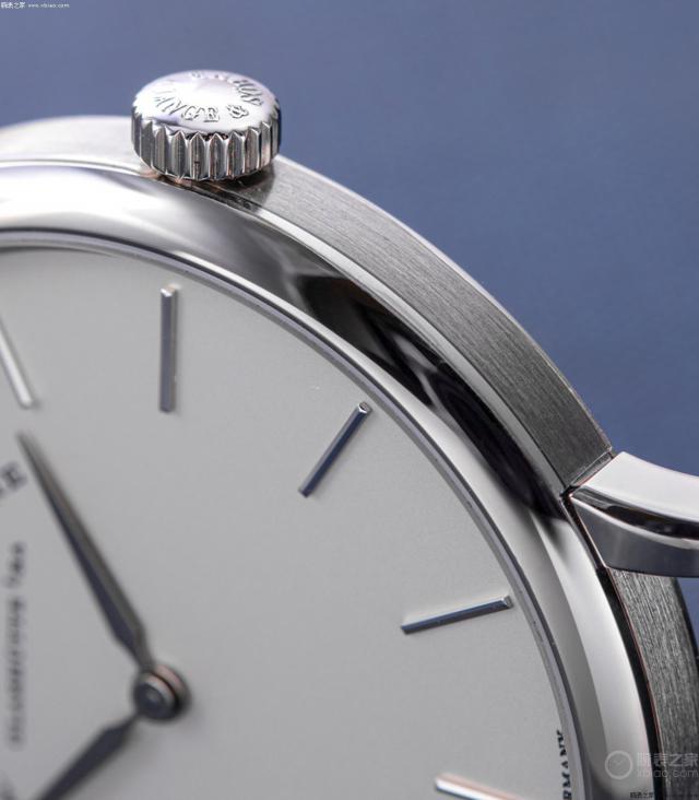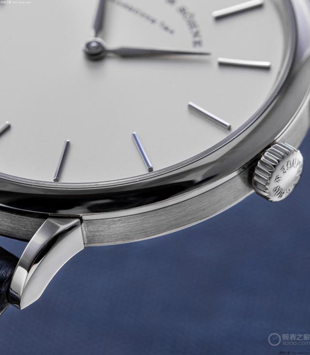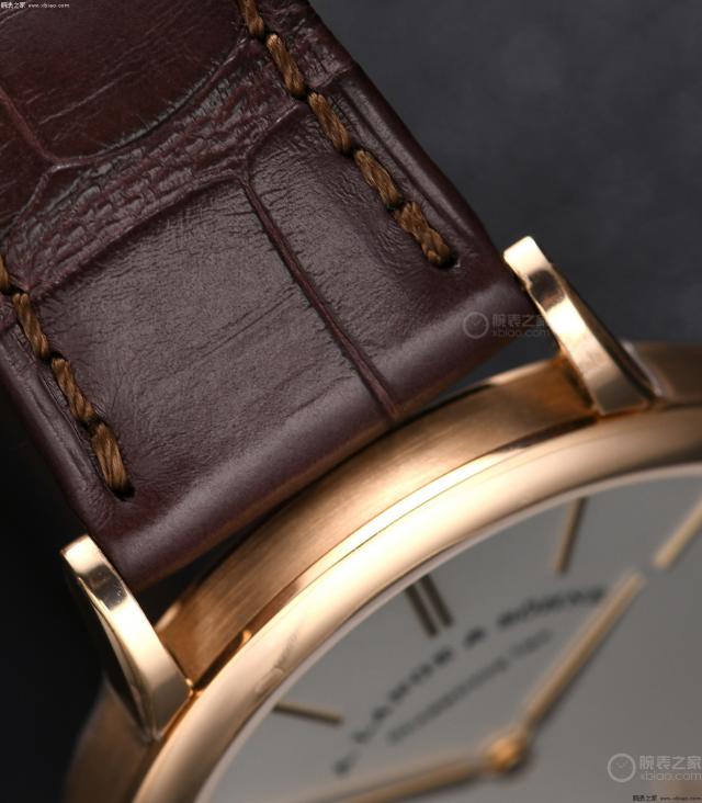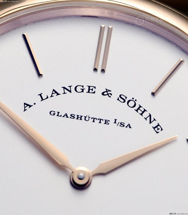 超薄的萨克森,是朗格至今最薄的手表。但是薄而薄,萨克森超薄的表壳,依然是朗格的“硬核”风格。表壳的侧面,是朗格标志性的“三段”结构。表壳中间部分水平拉丝,表壳上下两侧抛光。表耳,与表壳分离,然后焊接到表壳上。在表耳与表壳的接合处,朗格故意做了一个锋利的切口,让侧边拉丝深入表耳内侧。朗格的表壳结构比普通正装表一体冲压的表壳和大面积抛光要复杂得多。更加重要的是,即使是朗格的“复杂表” DATO,外壳和萨克森超薄,也是如此。