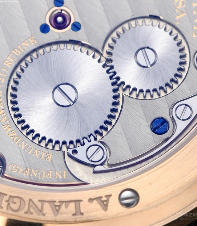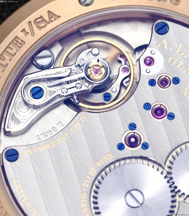 我们可以看到,L093.1 机芯,使用 3/4 夹板,手工雕刻鹅颈微调,金套蓝钢螺丝,这些朗格机芯的代表性特征,不少。可见的机芯,不可见的地方,都被打磨过。上夹板采用格拉苏蒂图案装饰,下夹板采用鱼鳞图案。特别是,从机芯大钢轮的止逆杠杆下,这一细微之处,还可以看到下层的鱼鳞纹。在擒纵轮轴眼处,有一个引人注目的抛光“盖帽”,这也是朗格运动的一大特点。各式各样的豪华装饰,在稍微泛金的德国银夹板上,极其耀眼。