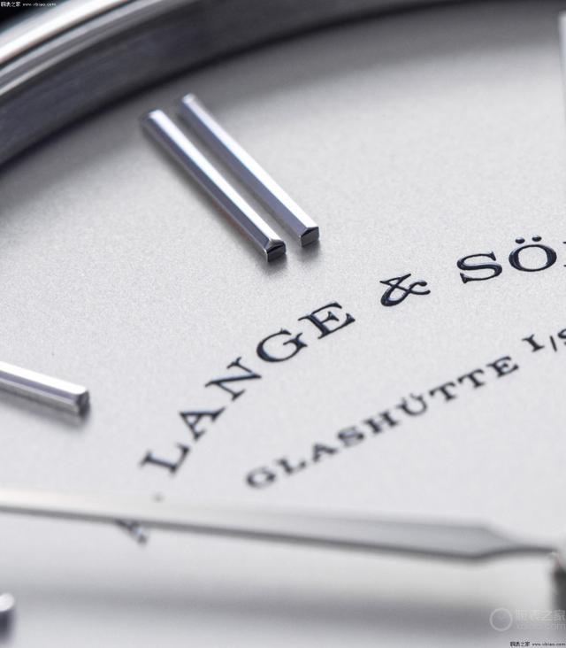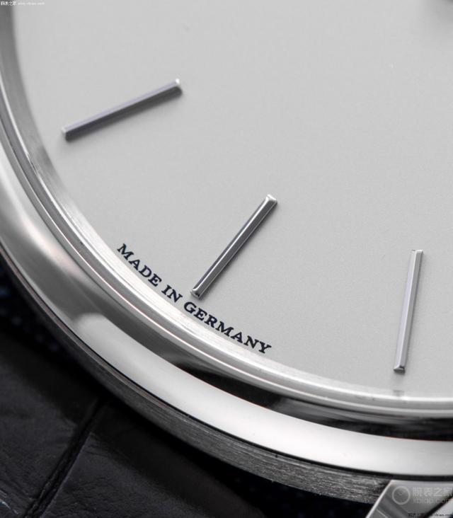 超薄的萨克森盘面,很简单,就是时针、分针、条形时标,但是它们的细节一点也不简单。超薄的萨克森盘面,是实心银盘,电镀后,形成这种白色(偏银),略带颗粒感。手表的指针,时标, 18K 金的。看似简单的条形时标,其实每一个,都有。 6 个切面。其中,铂金款,为使剑形指针更加明亮,在铂金指针上,再次镀金。