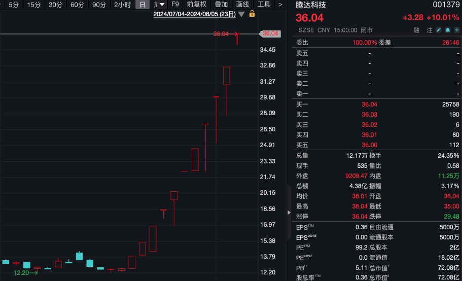 八月五日,腾达科技(001379)再次强势涨停,连续11板,最新收入36.04元/股,市值72.08亿元。