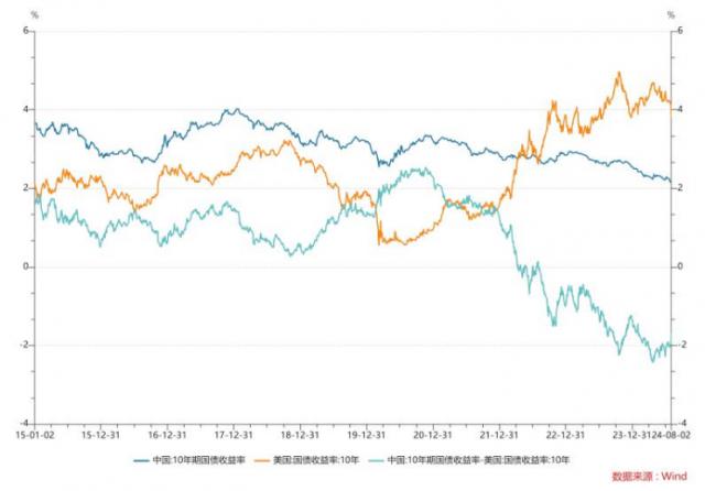 截至 8 月 2 日,中国 10 年债收益率 2.1161%,美国 10 年债收益率 两者之间的利差3.800% -168.39bp。