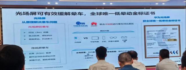 基于华为通信光的技术,华为为光源制定了一些衍射和映射方案。在这个范围内,衍射和映射可以让观测者通过光场屏幕看到高清图像、能力和映射。 AR-HUD 同样,在车内有限的空间内,实现大屏幕幅度不晕不累。华为联合中标机构进行了晕车对比测试。最终测试数据显示,华为光场屏获得了全球低晕金标证书。