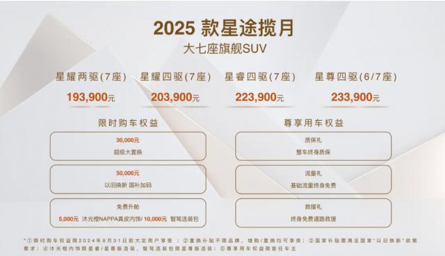 另外,买车也可以享受一系列的权益。8 月 31 前几天大订客户可以享受共享。 5 购车补贴和购车补贴共计1万元 1.5 免费升舱1万元:购车补贴权利包括: 3 1.5万元更换或增购补贴, 新旧置换国补和万元 5 千元星途加码;限时免费升舱包含价值 5 千元沐光橙 Nappa 皮革内饰包及价值 1 智驾选装包万元。此外,选购 25 第一位车主款星途揽月也享受全车终身保修,终身基础流量免费,终身免费道路救援。