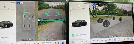 评估车辆的配置 360 全景图像,并提供透明底盘功能,方便驾驶员查看车辆底部道路。图像清晰度好,车辆周围的畸变控制合理,还配有泊车辅助线,实用性好。