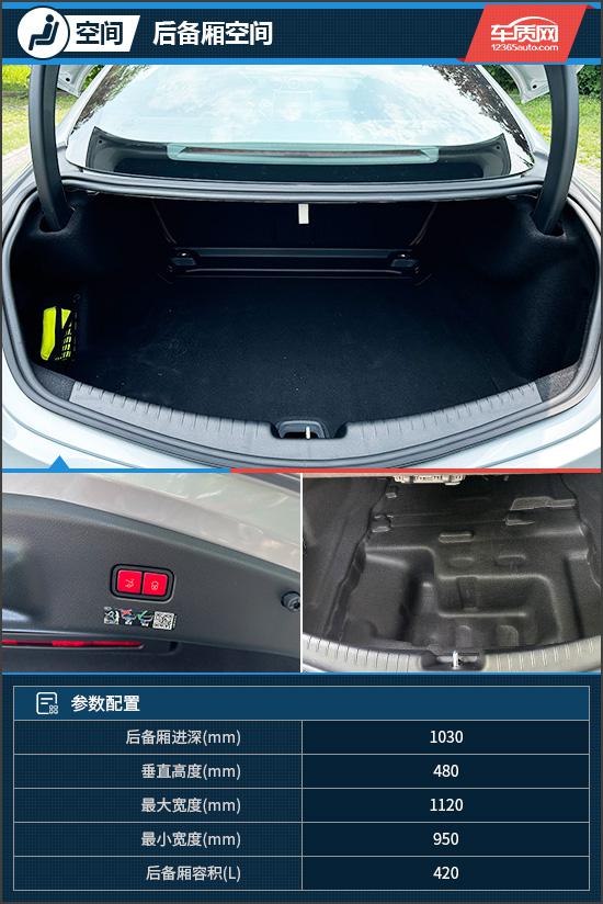 后备箱内部空间非常整洁,体积非常大。 420L,后排座椅也支持比例下降,可以进一步扩大使用空间。值得一提的是,后备箱下面还配有一个隐藏的储物格,可以放置很多物品,也有一定的私密性。