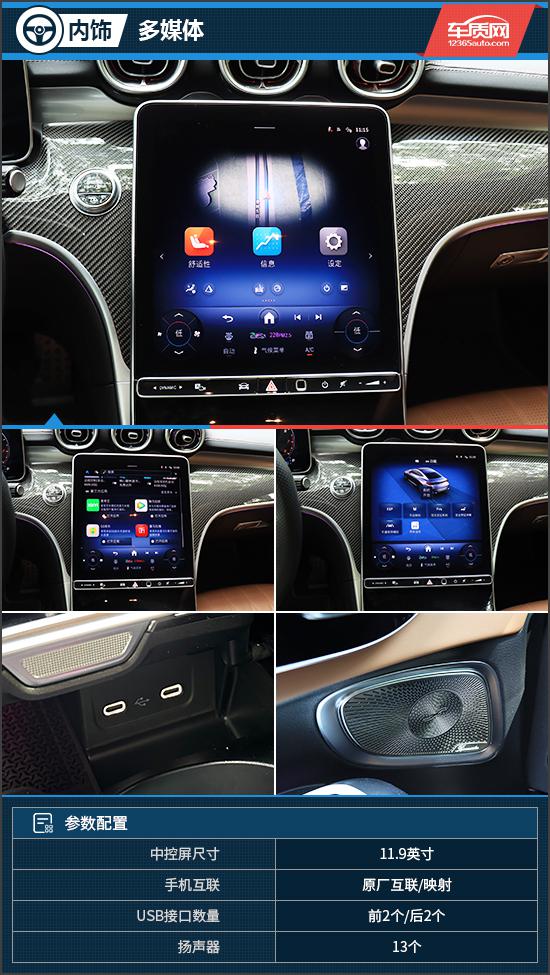在多媒体配置方面,评估车辆配置 11.9 英寸中控面板,虽然尺寸不大,但分辨率高,视觉观感极佳。另外,车内还有高通骁龙。 8295 芯片,性能非常强大,操作响应速度极佳,同时内部还配备了优异的性能, 5G 互联网,双区域智能语音助手,应用商城,OTA 升级等主流功能,综合性能完全不输造车新势力。值得注意的是,评估车已经配置好了 Burmester 柏林之声 3D 环绕立体声音响系统,整车拥有 13 一个音箱,音质非常出色,适合播放流行歌曲。