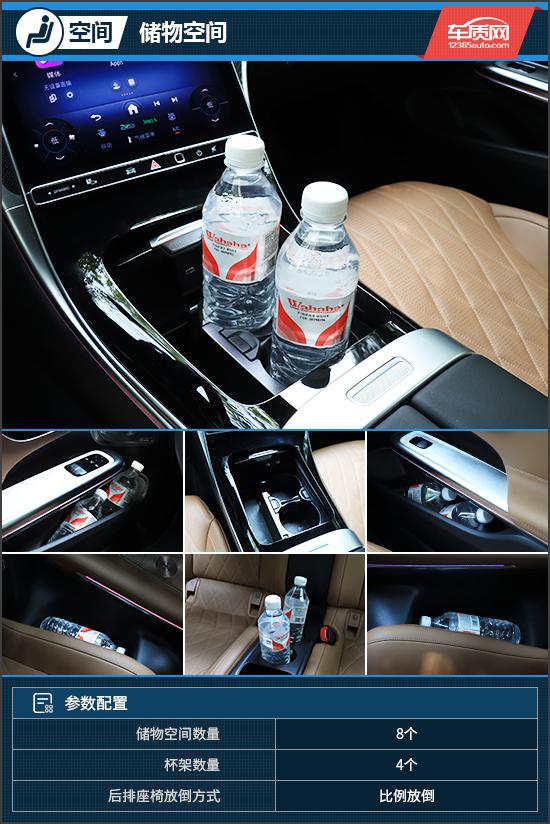 虽然评价汽车的收纳空间只是 8 个,数量不多,但是普通物品可以找到合适的地方放置。值得一提的是,中控屏下面还有一个带盖板的储物槽,里面有两个杯架、一个垂直储物槽和一个手机无线充电板。拿放手机很方便。