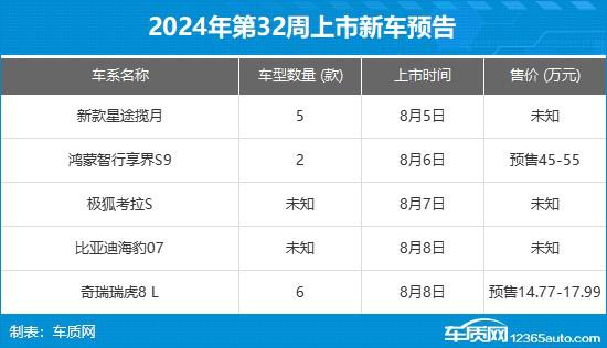 新车预告在2024年第32周(8月5日-8月11日)上市