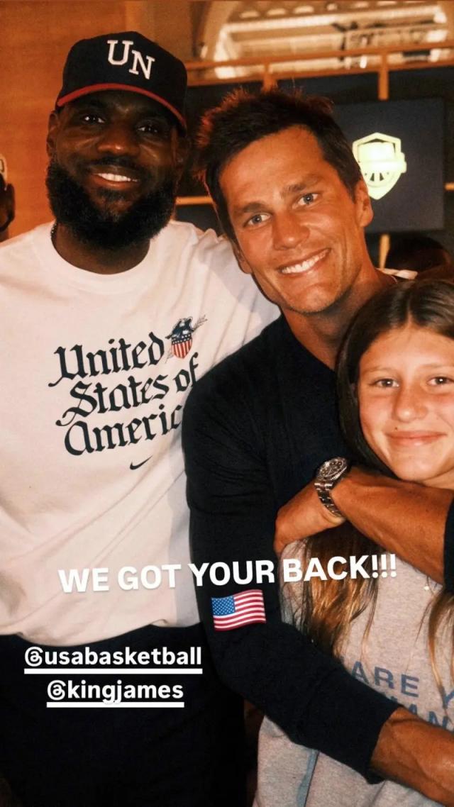 布雷迪写道:我们支持大家,关于他和詹姆斯的合照!� � � �@美国男篮 @詹姆斯。