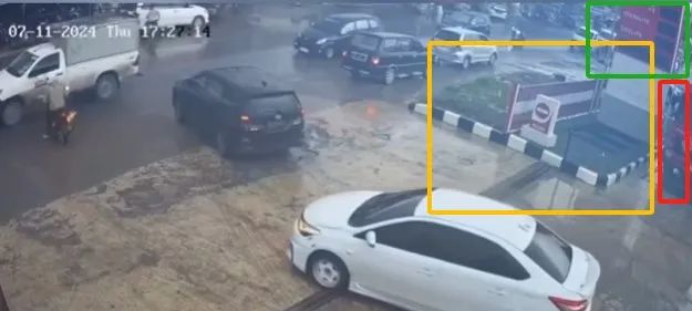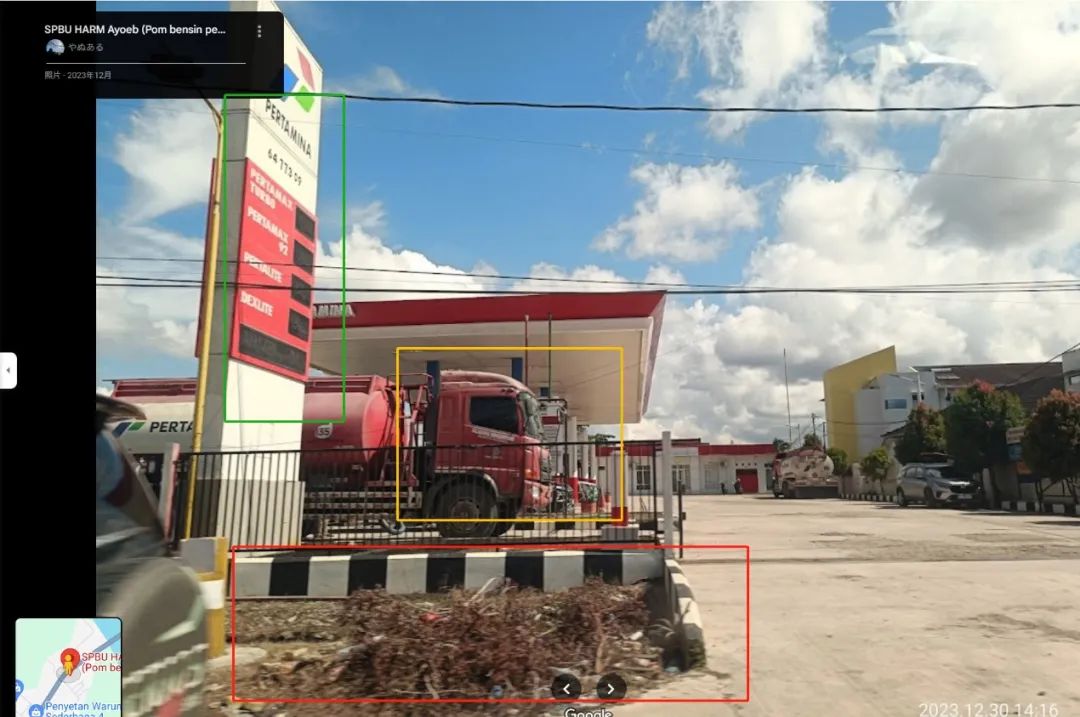Teluk定位谷歌地图 BayurKilo 2023年12月在5区域SPBU加油站拍摄的街景图与网络爆炸图片右下角的几个代表性元素完全一致,可见网络视频并不是在中国拍摄的。