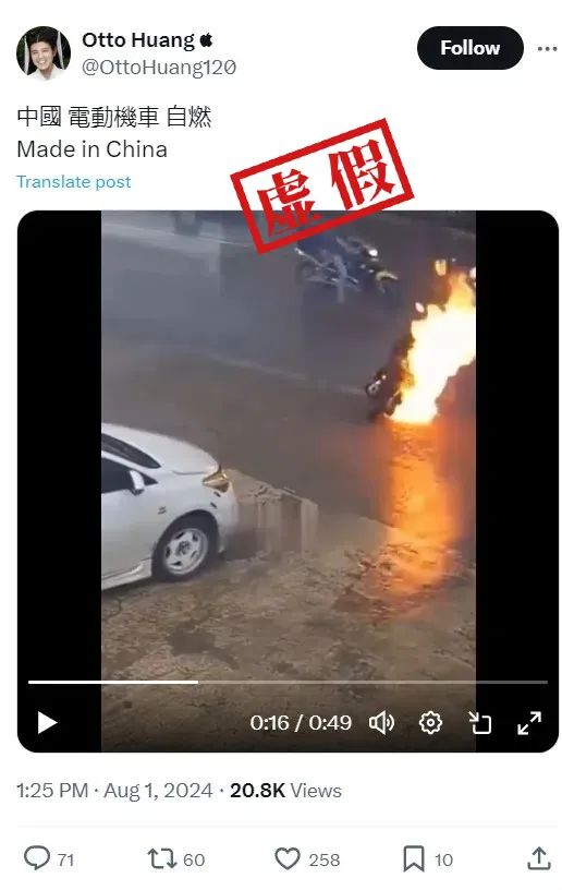 综上所述,网络视频实际上是在印度尼西亚东加里曼丹的一个加油站附近拍摄的。印尼媒体指出,这款车充满汽油后起火,与网上传播的“电动机车”完全不符。可以看出,这段视频与“中国电动机车”无关,无论是拍摄地点还是机车类型。