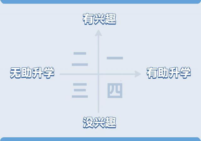本人为您提供两个参考层次,一个是孩子感兴趣的,另一个是有利于升学的,我们可以简单粗暴地使用四象限法进行选择。