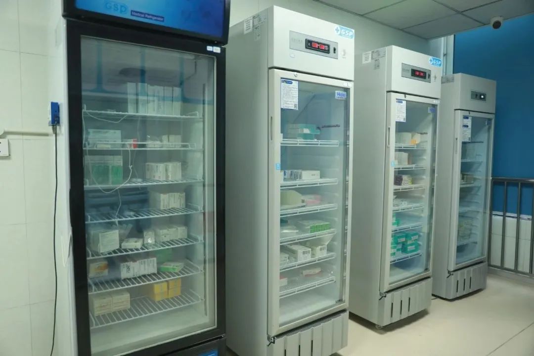 在城西社区卫生服务中心预防接种门诊的疫苗冷链室,医用冷藏冰箱内有序放置麻腮风疫苗、流感疫苗、人乳头瘤病毒疫苗等各种疫苗,工作人员实时监测温度,确保疫苗储存安全。