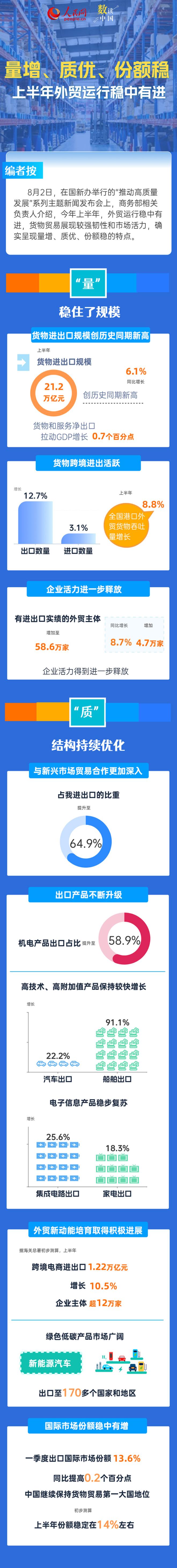 数量增加,质量高,份额稳定 上半年外贸运行稳步进步。