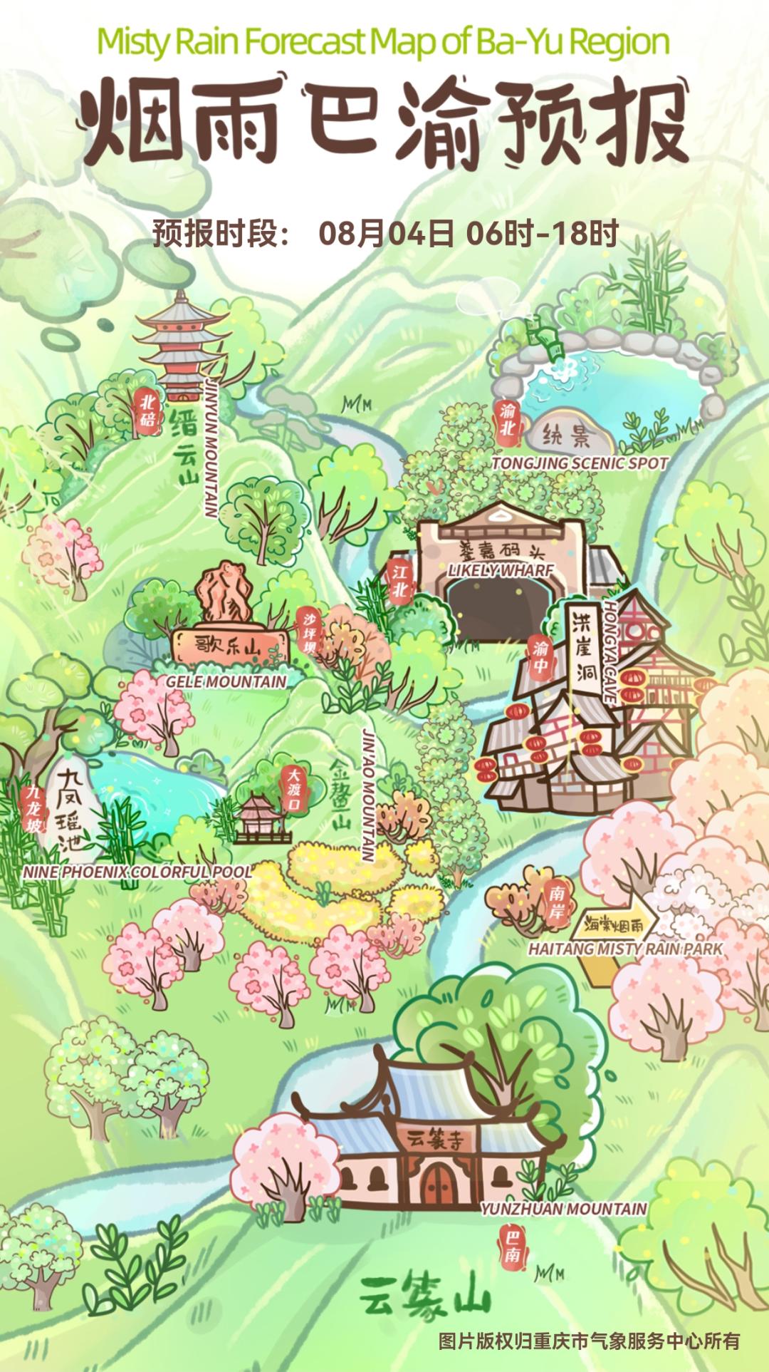 "烟雨景观,是指在细雨或薄雾中,自然景观被薄纱般的水汽笼罩,形成朦胧、梦幻般的视觉效果。据重庆市气象服务中心副主任刘青松介绍,目前,重庆市气象局已推出烟雨气象景观指数预报,即“烟雨巴渝”预报,可提供重庆市中心9个知名景点是否可能在近三天内每天6:00至18:00出现雨雾预报,供市民和游客参考,选择最佳时间和地点欣赏烟雨天气。