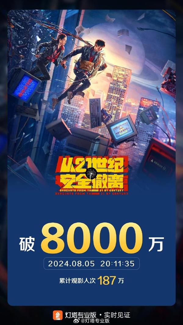 快科技 8 月 6 根据灯塔专业版的实时动态显示,截至 8 月 5 日 20 时 11 分,电影《从》 21 《世纪安全撤离》的票房已经突破 8000 万元。