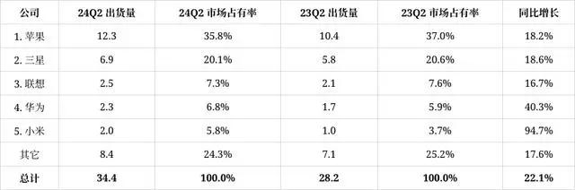 市场调研机构IDC发布了2024年第二季全球平板电脑市场报告,苹果以1230万的出货量排名第一,三星和联想分别以690万和250万排名第二和第三。在前五大品牌中,华为和小米实现了爆发性增长,同比增长40.3%和94.7%。