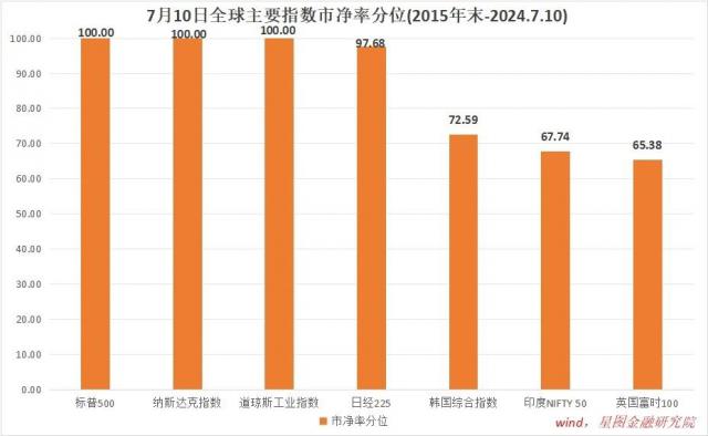近年来,全球主要股票市场一直走强势市场,屡创新高。 2024 年 7 月 10 日前后,全球主要股市陆续达到市场高点,美股三大指数 2016 到目前为止,市净率分位值均达到 100%,日经 225 指数也高达 97.68%。