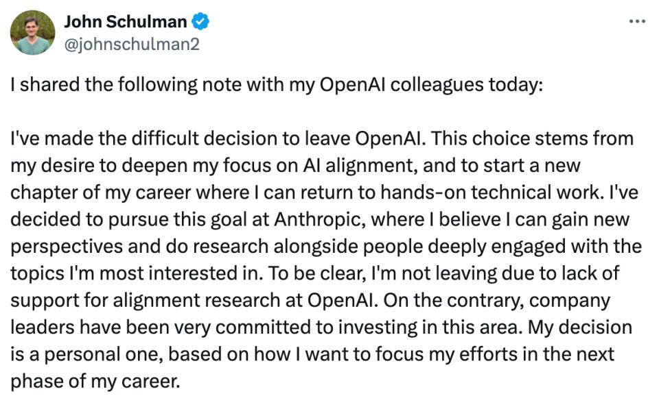舒尔曼在社交平台X上宣布了自己离职的消息。他称自己希望进一步关注人工智能对齐,重返实际技术工作,并决定在Anthropic追求这一目标。他还强调,自己离开OpenAI并不是因为缺乏对对齐研究的支持。