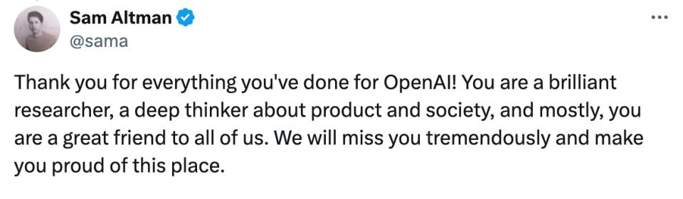 对于舒尔曼的离职,奥特曼在社交媒体X上发帖表示:“感谢你为OpenAI所做的一切!你是一位杰出的研究者,对产品和社会有着深刻的思考,最重要的是,你是我们所有人的好朋友。我们会非常想念你,让你为这个地方感到骄傲。