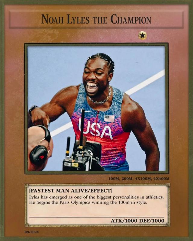 我还记得美国短跑运动员诺亚,在巴黎奥运会全美预选赛上亮出“青眼白龙”等“游戏王”的经典卡片。 · 莱尔斯吗?