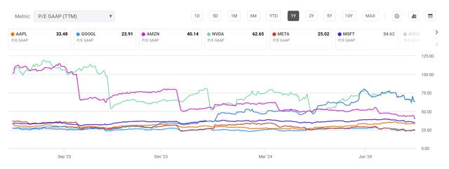 问题是,与苹果的增长率相比,市盈率过高。无论从收入,EBITDA 还是 EPS 从这个角度来看,苹果的百分比增长率是个位。大型市值企业的同行增长率很强,达到两位数甚至更多。在页面上比较同行 PEG 比例显示,苹果 PEG 比例超出 3,但是大多数其它大型市值企业 PEG 比例低于 1。