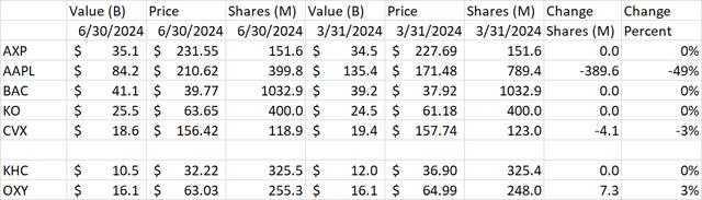 一般来说,伯克希尔的季度报告只反映渐进的变化,没有重大的新闻项目。但2024 2008年第二季度的情况并非如此,我们可以看到伯克希尔出售了他最大的股票头寸苹果 (AAPL) 的近一半。伯克希尔从第一季度开始 9.05 亿股减持至 7.9 亿股,减持幅度已经达到 13%,但是在第二季度,伯克希尔再次出售了惊人的销售。 3.9 亿股,减少了头寸 49%,至 4 亿股。