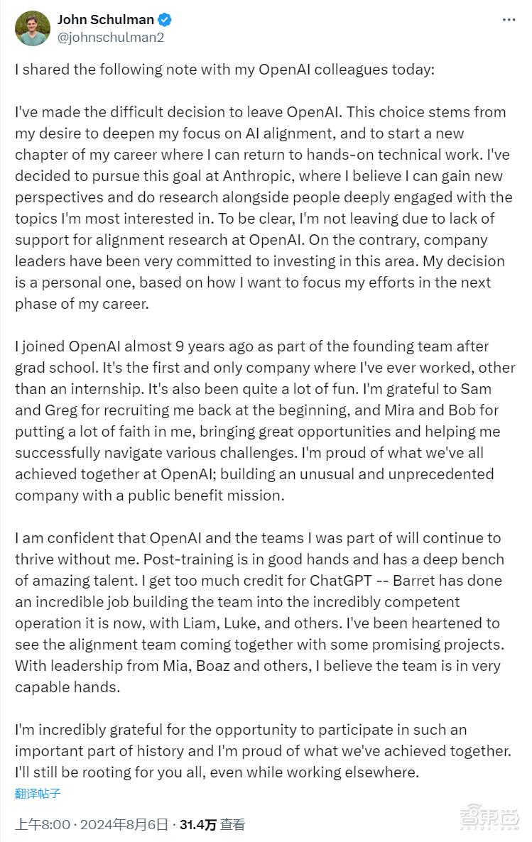 智东西八月六日消息,刚才,JohnAI创始人,ChatGPT后期训练负责人John Schulman于社交媒体X宣布辞职,Anthropic跳槽到OpenAI竞争者。从事技术研究。