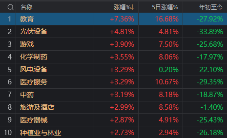 板块方面,教育、光伏、游戏、创新药品等板块涨幅居前,保险、网约车、汽车整车、银行等板块跌幅居前。