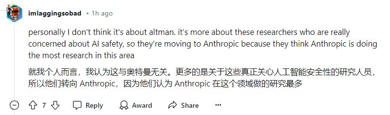 一些网民认为,高级研究员的离开代表着技术的离开,并担心现阶段OpenAI员工流失的现状。而且Anthropic吸纳了很多OpenAI老员工,可能会成为下一个技术领先的企业。