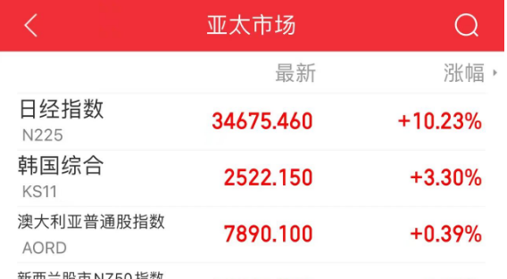亚太市场正在反弹。韩国综合指数上涨3%以上,日经225指数上涨10%以上!