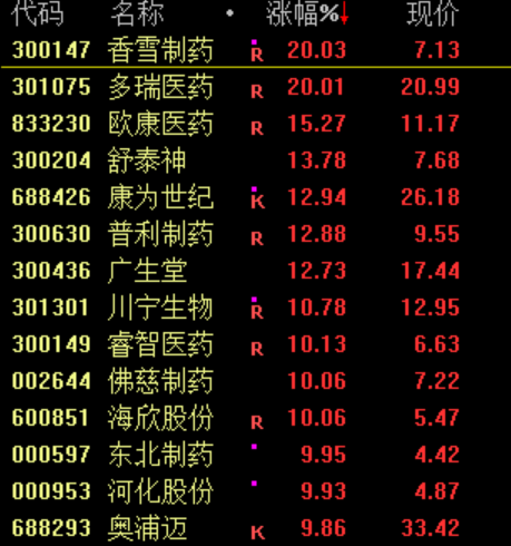 医药股上涨,河化股份连续6板,香雪药业、多瑞药业、东北药业、佛慈药业等多股涨停。
