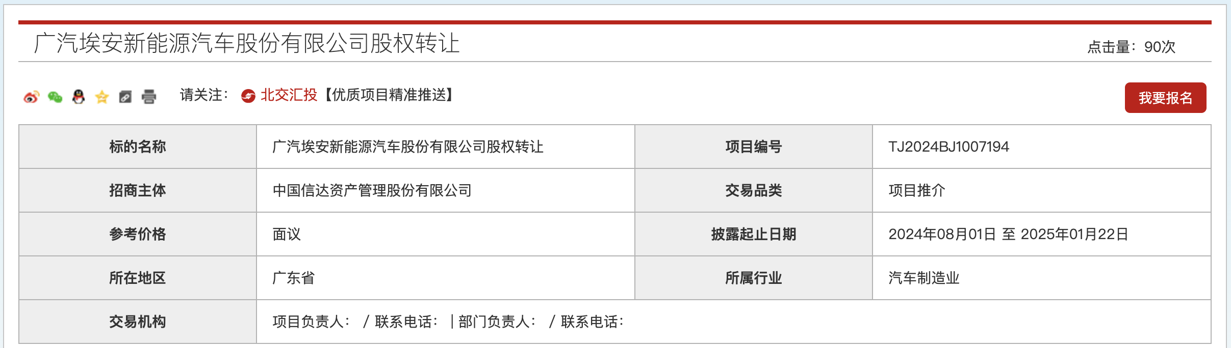 近日,北京产权交易所发布通知,通知广汽埃安新能源汽车有限公司(以下简称广汽埃安)股权转让。公告显示,投资主体为中国信达资产管理有限公司(以下简称中国信达)。
