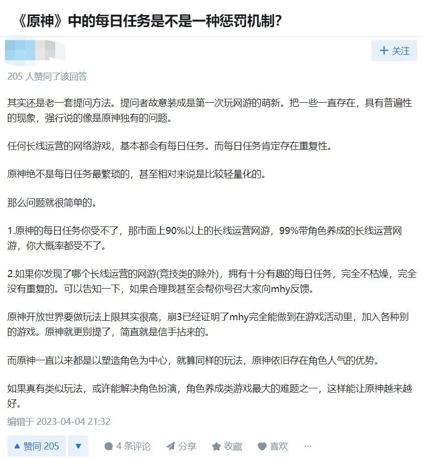 两年前,在知乎问“原神的日常任务是否是一种惩罚机制”时,你可以看到大多数回答问题的人都对这个问题保持“否定”的态度。