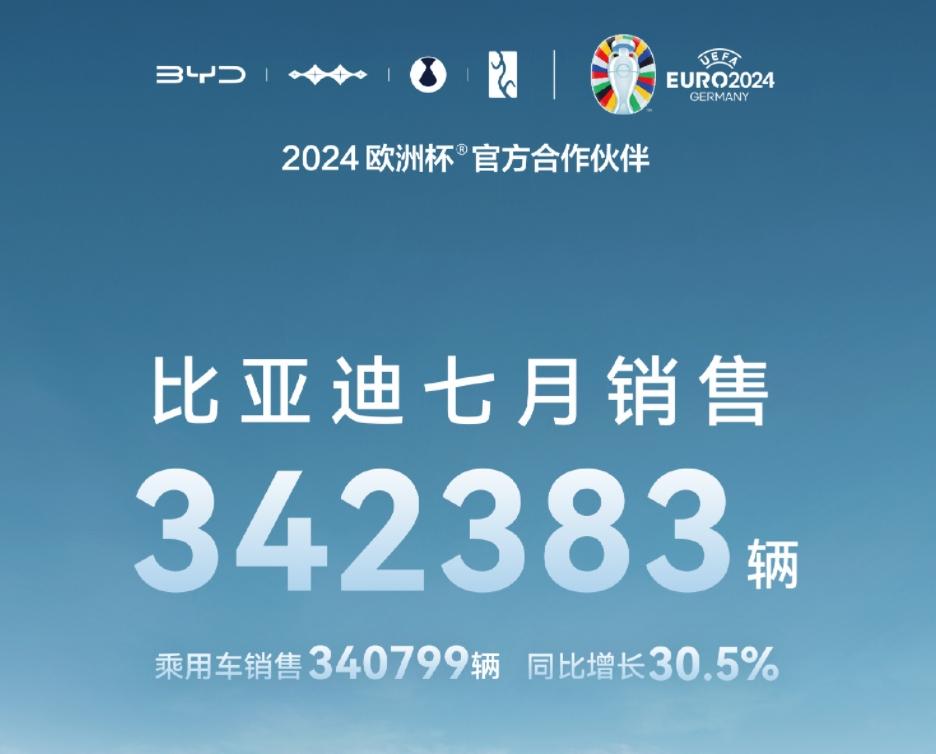 看看所有的中国品牌,比亚迪仍然是销售的领头羊。七月份,比亚迪全系销售新能源汽车342,383辆,同比增长30.5%,环比下降0.2%。比亚迪乘用车的累计销量在今年1-7月达到1,947,944辆,已超过2022年(186.34万辆)。值得注意的是,这个月已经是比亚迪连续第五个月月销售额超过30万辆。