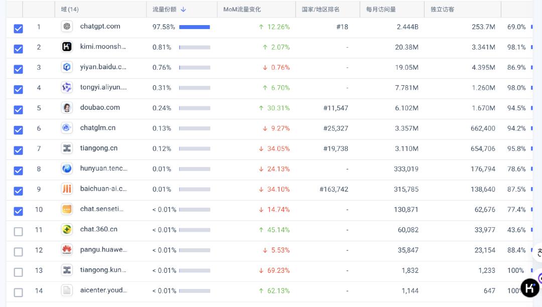 投放效果如何?根据最新数据(七月),据国内主流大模式(AI对话)统计,只有Kimi和文心一言两语,月活超过1000万;超过100万只有4个。ChatGPT是世界上唯一一个拥有24亿月活量的人。